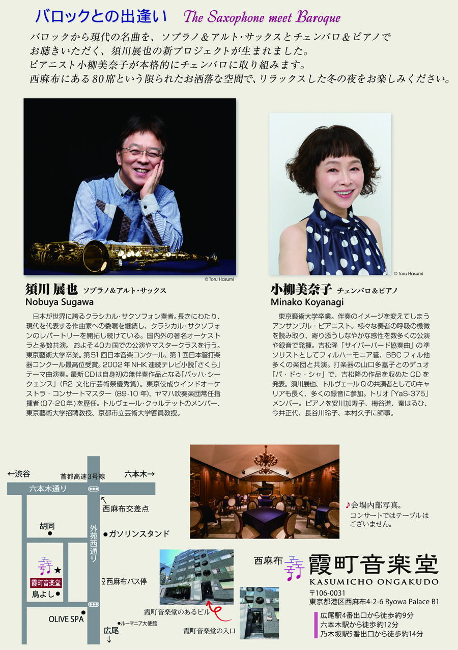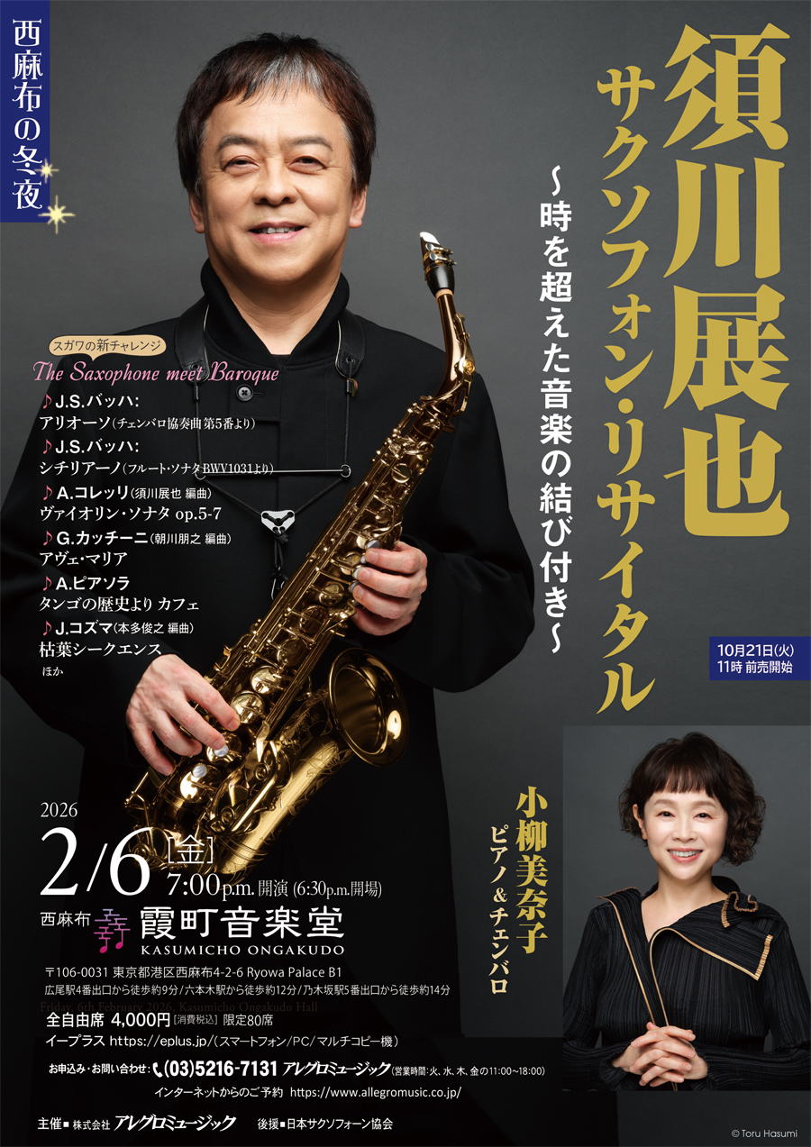 The Saxphone meet Baroque スガワの新チャレンジ! 須川展也サクソフォン・リサイタル 〜時を超えた音楽の結び付き〜 2026年 2月6日(金) 7:00p.m.開演 [6:30p.m.開場] ◆ 霞町音楽堂 Friday, 6th February 2026, KASUMICHO ONGAKUDO(西麻布) 全席自由 4,000円 <限定 80席> ≪チケットお取り扱い≫ 10月21(火) 午前11時発売開始 イープラス:https://eplus.jp/sf/detail/4414870001-P0030001 チケットのお申込み・お問い合わせ: TEL:(03)5216-7131 アレグロミュージック(営業時間: 火〜金曜日 11:00〜18:00) 営業時間外は、恐れ入りますがメールにてお問い合わせをお願いいたします。 (座席選択をご希望の場合は、アレグロミュージックまでお電話ください) バロックとの出逢い バロックから現代の名曲を、 ソプラノ&アルト・サックスとチェンバロ&ピアノでお聴きいただく、 須川展也の新プロジェクトが生まれました。 [予定プログラム] J.S.バッハ:アリオーソ、シチリアーノ A.コレッリ:ヴァイオリン・ソナタ Op.5-7 G.カッチーニ:アヴェ・マリア A.ピアソラ: タンゴの歴史より カフェ J.コズマ:枯葉シークエンス ほか